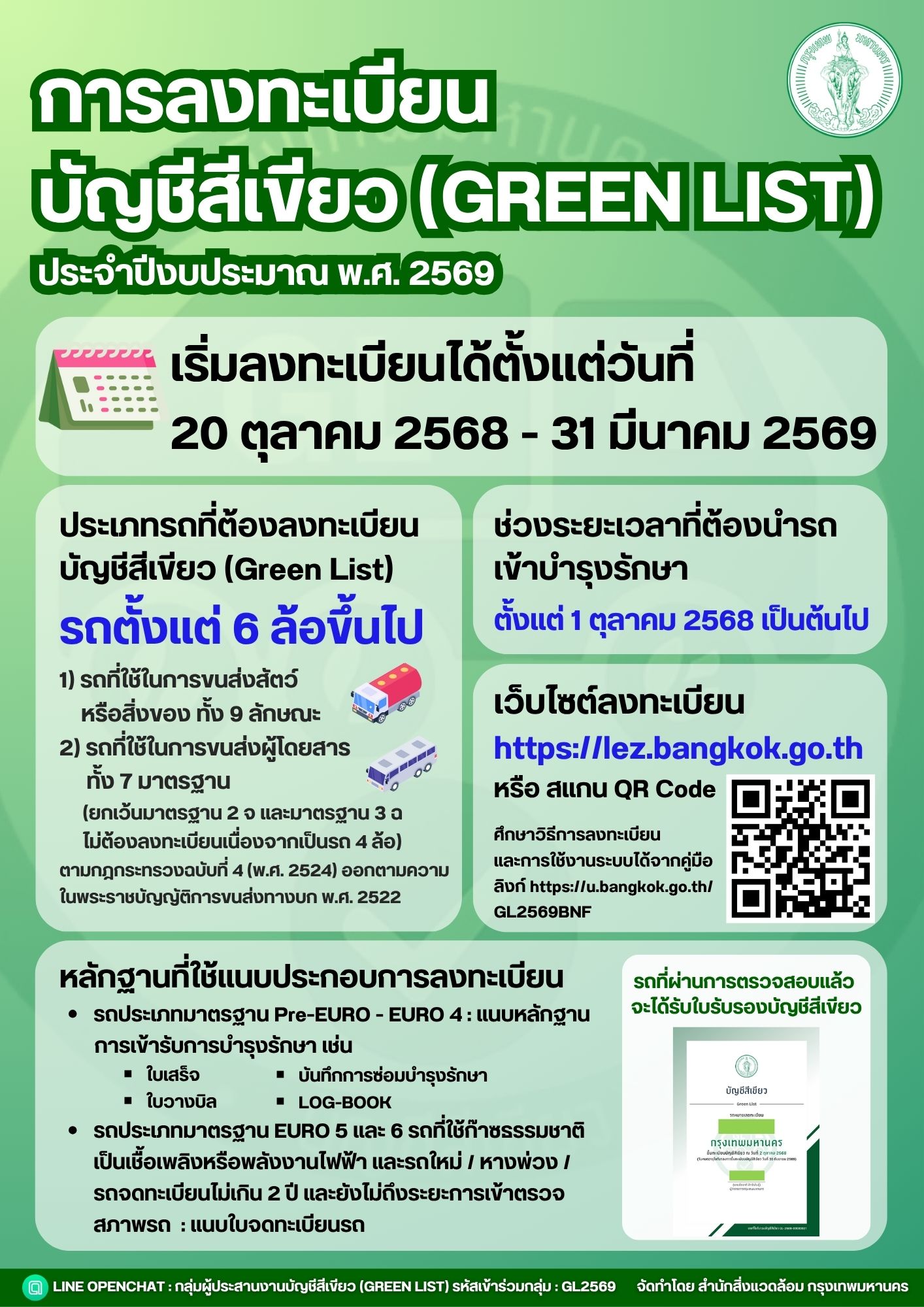 กรุงเทพมหานคร ออกมาตรการให้รถบรรทุกที่มีขนาดตั้งแต่ 6 ล้อขึ้นไป จะต้องขึ้นทะเบียนรถ บัญชีสีเขียว (Green List) เพื่อเข้าพื้นที่เขตมลพิษต่ำ (Low Emission Zone) สามารถลงทะเบียนได้ตั้งแต่ 20 ตุลาคม 2568 – 31 มีนาคม 2569