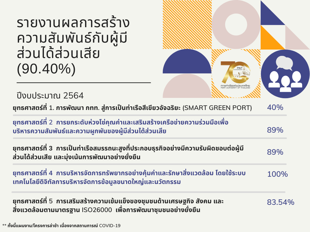 ภาพรวมของผลดำเนินงานตามตามแผนยุทธศาสตร์การบริหารจัดการและสร้างความสัมพันธ์กับผู้มีส่วนได้ส่วนเสียของ กทท. ประจำปี 2564  ซึ่งประกอบไปด้วย 5 ยุทธศาสตร์ 44 แผนงาน/โครงการ