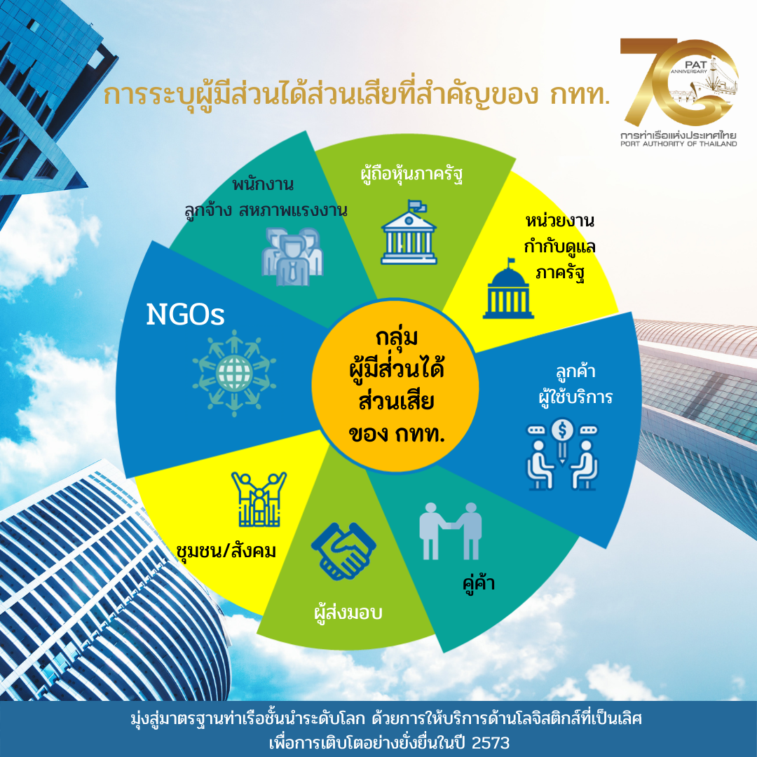 กทท. และผู้มีส่วนได้ส่วนเสียทุกกลุ่ม โดยผ่านการมีส่วนร่วมกับผู้มีส่วนได้ส่วนเสีย ซึ่งเป็นพื้นฐานสำคัญที่ทำให้เกิดความเข้าใจในความต้องการ ความคาดหวัง ความสนใจของผู้มีส่วนได้ส่วนเสีย เป็นไปตามการกำกับดูแลกิจการที่ดี และยังเป็นรากฐานที่สำคัญต่อการดำเนินธุรกิจในปัจจุบันและทำให้เกิดการพัฒนาในอนาคต การเข้าไปมีส่วนร่วมนี้เป็นกระบวนการที่ทำให้เกิดการสื่อสารกับผู้มีส่วนได้ส่วนเสียอย่างต่อเนื่อง ครอบคลุมในด้านเศรษฐกิจ สังคมหรือสิ่งแวดล้อม ซึ่งกระบวนการเหล่านี้ทำให้การท่าเรือฯ สามารถลดผลกระทบเชิงลบและขยายผลกระทบเชิงบวกได้อย่างต่อเนื่องและมีประสิทธิภาพสอดคล้องกับกลยุทธ์การดำเนินงานขององค์กร
